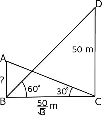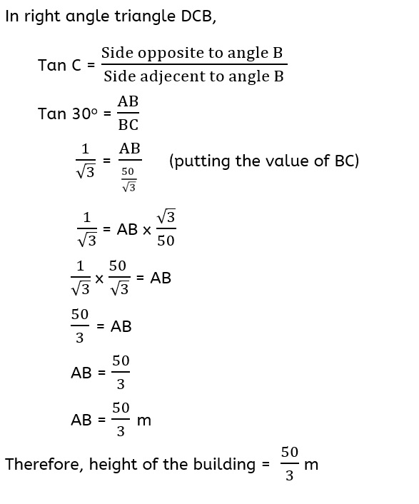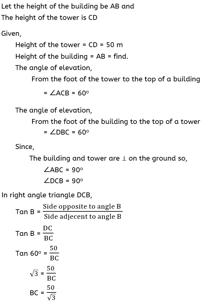 Q.9) The angle of elevation of the top of a building from the foot of the tower is 30° and the angle of elevation of the top of the tower from the foot of the building is 60°. If the tower is 50 m high, find the height of the building.