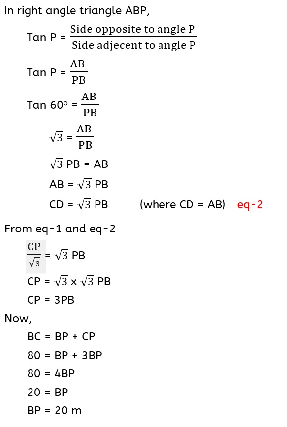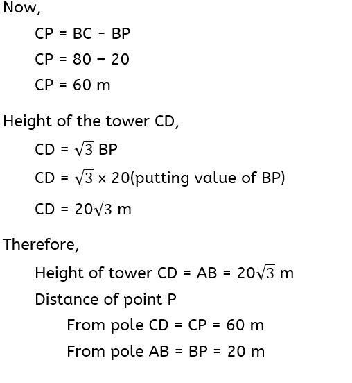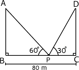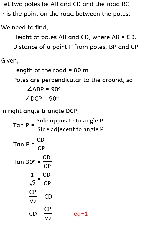 Q.10) Two poles of equal heights are standing opposite each other on either side of the road, which is 80 m wide. From a point between them on the road, the angles of elevation of the top of the poles are 60° and 30°, respectively. Find the height of the poles and the distances of the point from the poles.