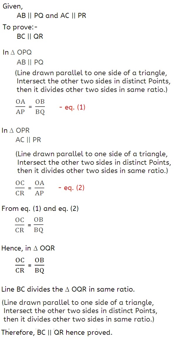 / X - Triangles Ex - 6.2 / By Sadhana Bhadoriya Ex – 6.2 Que No. 6 Q.6) In Fig. 6.21, A, B and C are points on OP, OQ and OR respectively such that AB || PQ and AC || PR. Show that BC || QR. Solution:- Next Ex – 6.2 Que No. 1 Ex – 6.2 Que No. 2 Ex – 6.2 Que No. 3 Ex – 6.2 Que No. 4 Ex – 6.2 Que No. 5 Ex – 6.2 Que No. 6 Ex – 6.2 Que No. 7 Ex – 6.2 Que No. 8 Ex – 6.2 Que No. 9 Ex – 6.2 Que No. 10