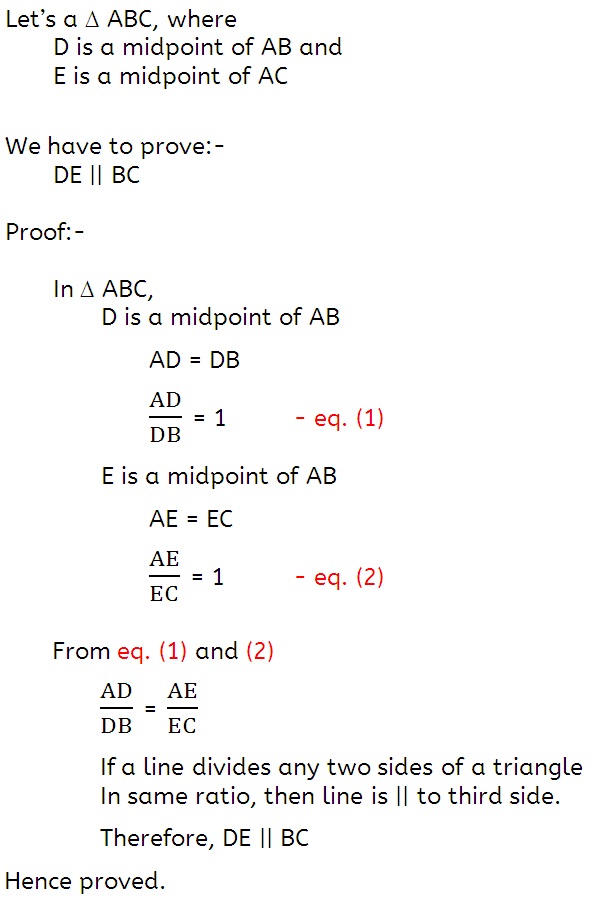 Q.8) Using Theorem 6.2, prove that the line joining the mid-points of any two sides of a triangle is parallel to the third side. (Recall that you have done it in Class IX).