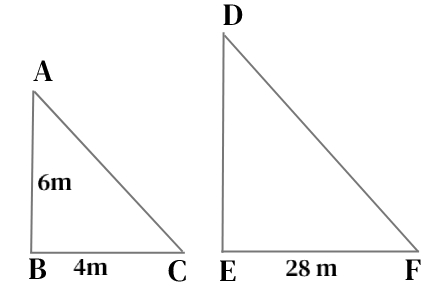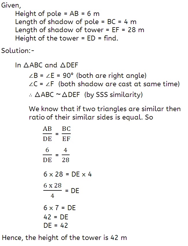 Q.15) A vertical pole of length 6 m casts a shadow 4 m long on the ground and at the same time a tower casts a shadow 28 m long. Find the height of the tower.