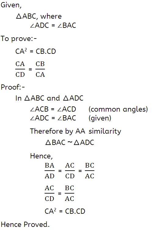 / X - Triangles Ex - 6.3 / By Sadhana Bhadoriya Ex – 6.3 Que No. 13 Q.13) D is a point on the side BC of a triangle ABC such that ∠ADC = ∠BAC. Show that CA2 = CB.CD Solution:- Next Ex – 6.3 Que No. 1 Ex – 6.3 Que No. 2 Ex – 6.3 Que No. 3 Ex – 6.3 Que No. 4 Ex – 6.3 Que No. 5 Ex – 6.3 Que No. 6 Ex – 6.3 Que No. 7 Ex – 6.3 Que No. 8 Ex – 6.3 Que No. 9 Ex – 6.3 Que No. 10 Ex – 6.3 Que No. 11 Ex – 6.3 Que No. 12 Ex – 6.3 Que No. 13 Ex – 6.3 Que No. 14 Ex – 6.3 Que No. 15 Ex – 6.3 Que No. 16