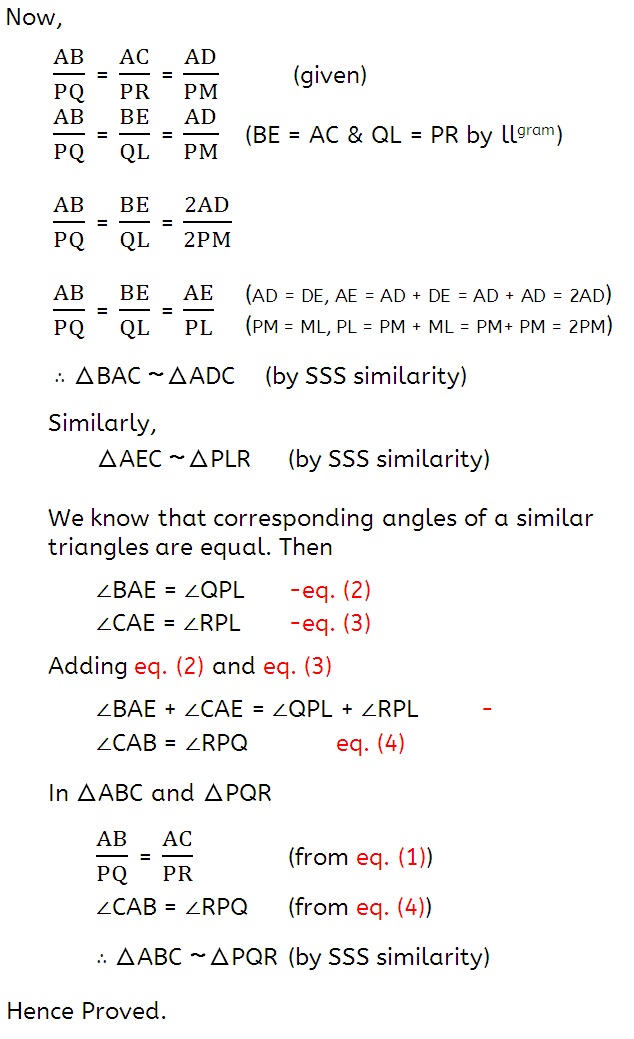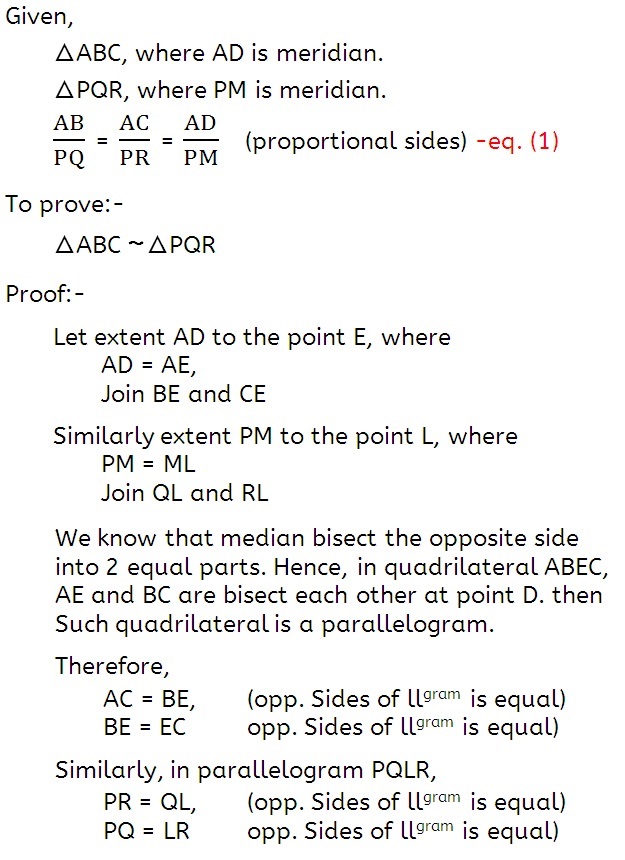 / X - Triangles Ex - 6.3 / By Sadhana Bhadoriya Ex – 6.3 Que No. 14 Q.14) Sides AB and AC and median AD of a triangle ABC are respectively proportional to sides PQ and PR and median PM of another triangle PQR. Show that △ABC ~ △PQR. Solution:- Next Ex – 6.3 Que No. 1 Ex – 6.3 Que No. 2 Ex – 6.3 Que No. 3 Ex – 6.3 Que No. 4 Ex – 6.3 Que No. 5 Ex – 6.3 Que No. 6 Ex – 6.3 Que No. 7 Ex – 6.3 Que No. 8 Ex – 6.3 Que No. 9 Ex – 6.3 Que No. 10 Ex – 6.3 Que No. 11 Ex – 6.3 Que No. 12 Ex – 6.3 Que No. 13 Ex – 6.3 Que No. 14 Ex – 6.3 Que No. 15 Ex – 6.3 Que No. 16