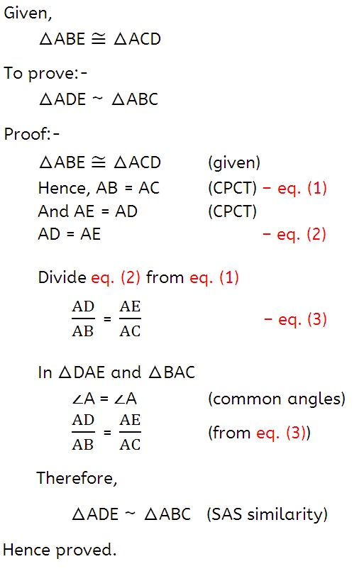 Ex – 6.3 Que No. 6 / X - Triangles Ex - 6.3 / By Sadhana Bhadoriya Ex – 6.3 Que No. 6 Q.6) In Fig. 6.37, if △ABE ≅ △ACD, shows that △ADE ~ △ABC. Solution:- Next Ex – 6.3 Que No. 1 Ex – 6.3 Que No. 2 Ex – 6.3 Que No. 3 Ex – 6.3 Que No. 4 Ex – 6.3 Que No. 5 Ex – 6.3 Que No. 6 Ex – 6.3 Que No. 7 Ex – 6.3 Que No. 8 Ex – 6.3 Que No. 9 Ex – 6.3 Que No. 10 Ex – 6.3 Que No. 11 Ex – 6.3 Que No. 12 Ex – 6.3 Que No. 13 Ex – 6.3 Que No. 14 Ex – 6.3 Que No. 15 Ex – 6.3 Que No. 16